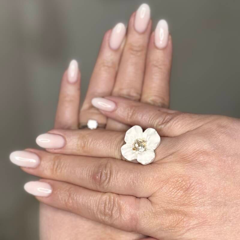 Découvrez cette bague unique, entièrement façonnée à la main pour un rendu authentique et raffiné. Réalisée en jesmonite, un matériau innovant et résistant, elle est ornée d’éclats de coquillage délicatement brisés à la main, offrant ainsi un design naturel et élégant.