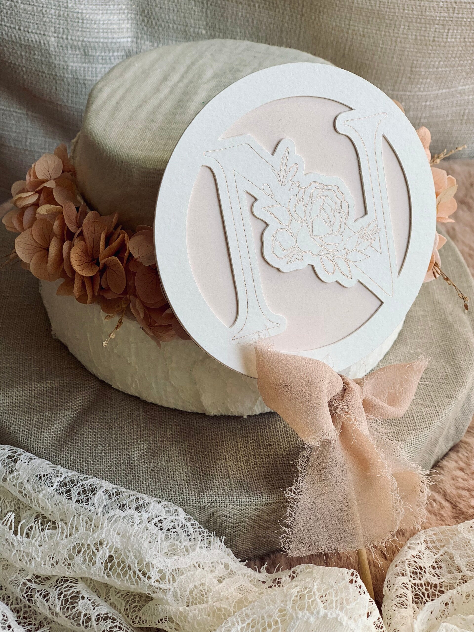 Fond rose pâle, lettre fleuri avec ses fleurs en foil rose gold.