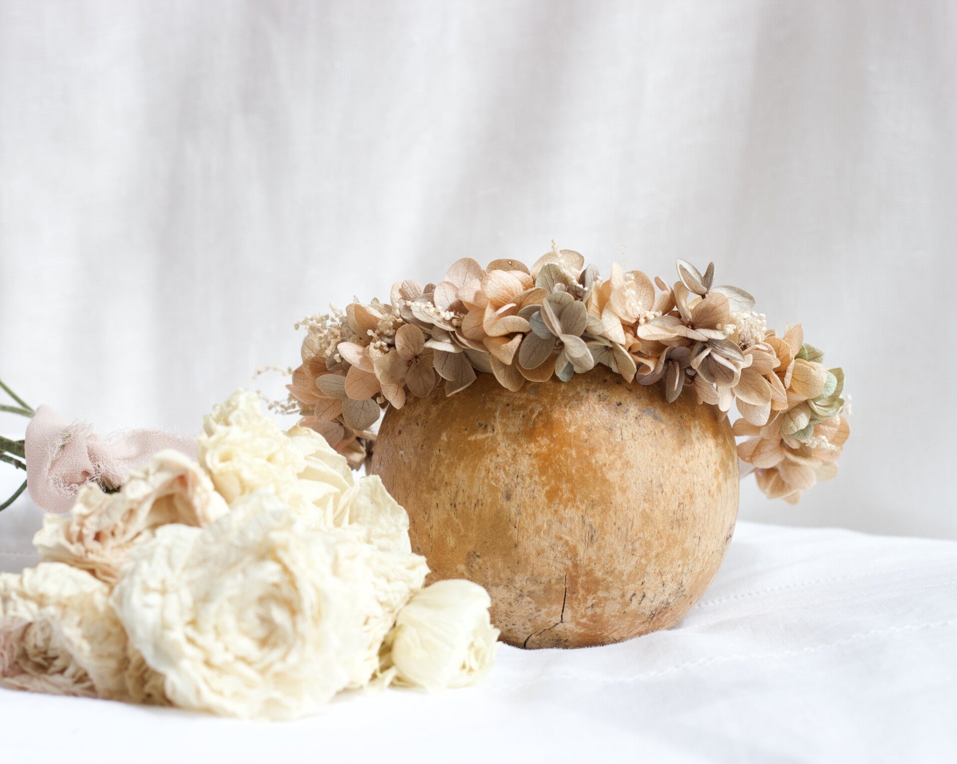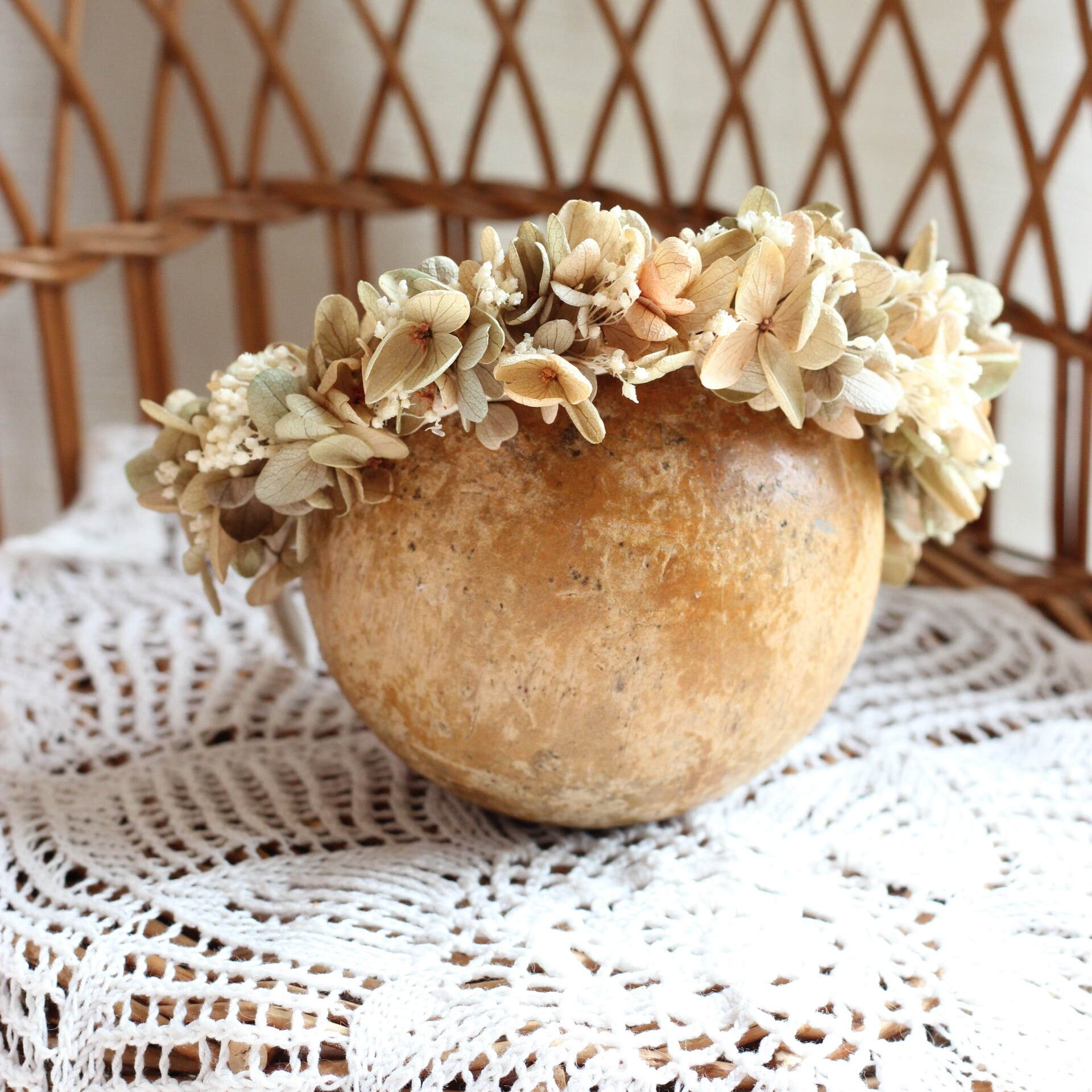 Entièrement fleuri d'hortensias couleur sublime et unique dans un dégradé du vert pâle et beige rosé et petit détails en broom bloom avec un beau volume (style couronne).