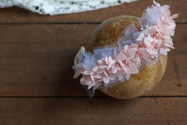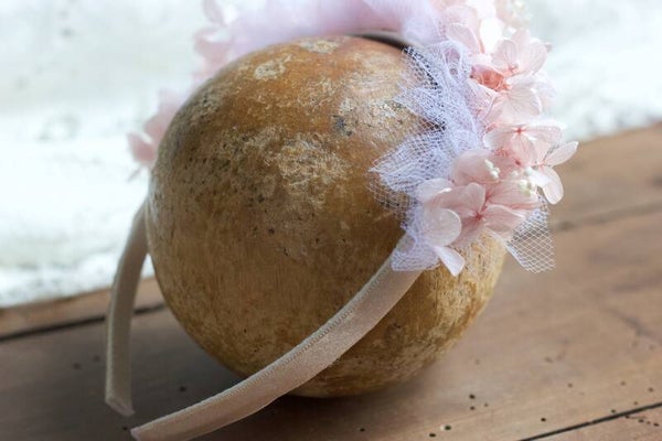Fleuri d'hortensias couleur rose tendre et tulle blanc, petit détails en broom bloom.