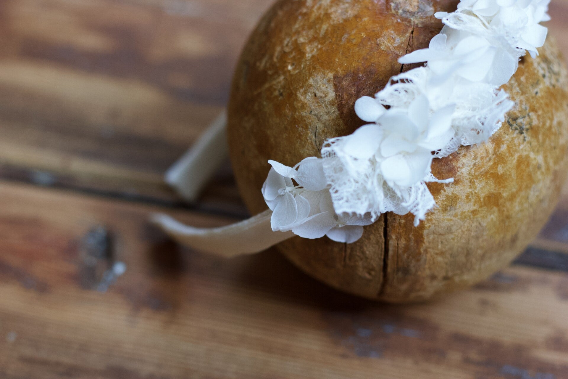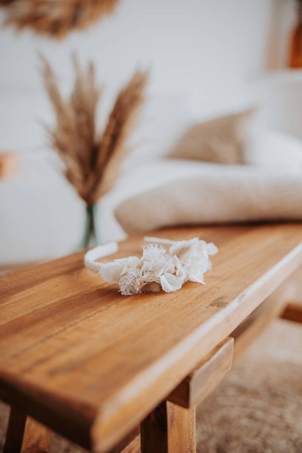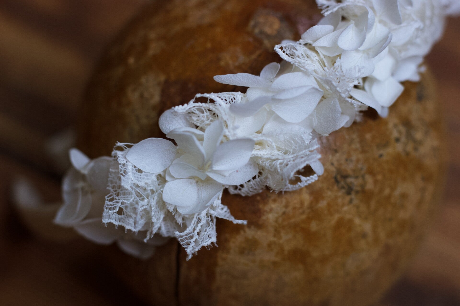 Serre-tête dentelle et hortensia préservé blanche.