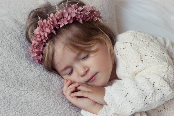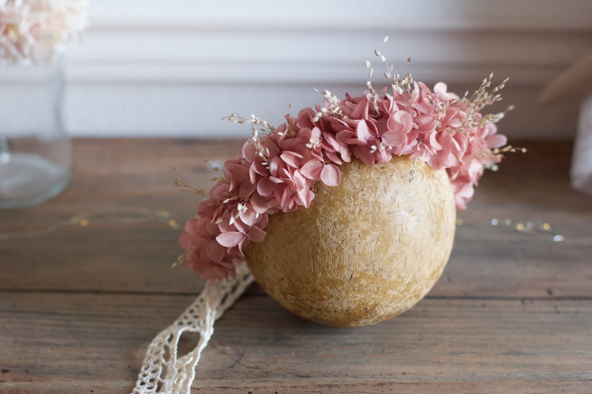 Couronne de tête fait main, avec des hortensias de qualité dans le coloris vieux rose.Taille adaptable à partir de 6 mois.