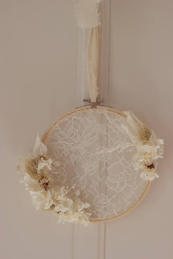 De la dentelle, des fleurs séchées et préservées, le tout monté sur un tambour en bois 18 cm.