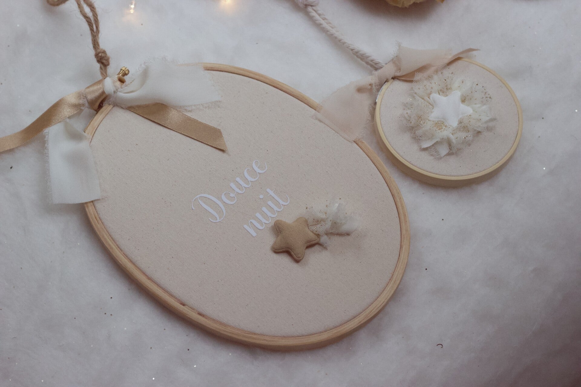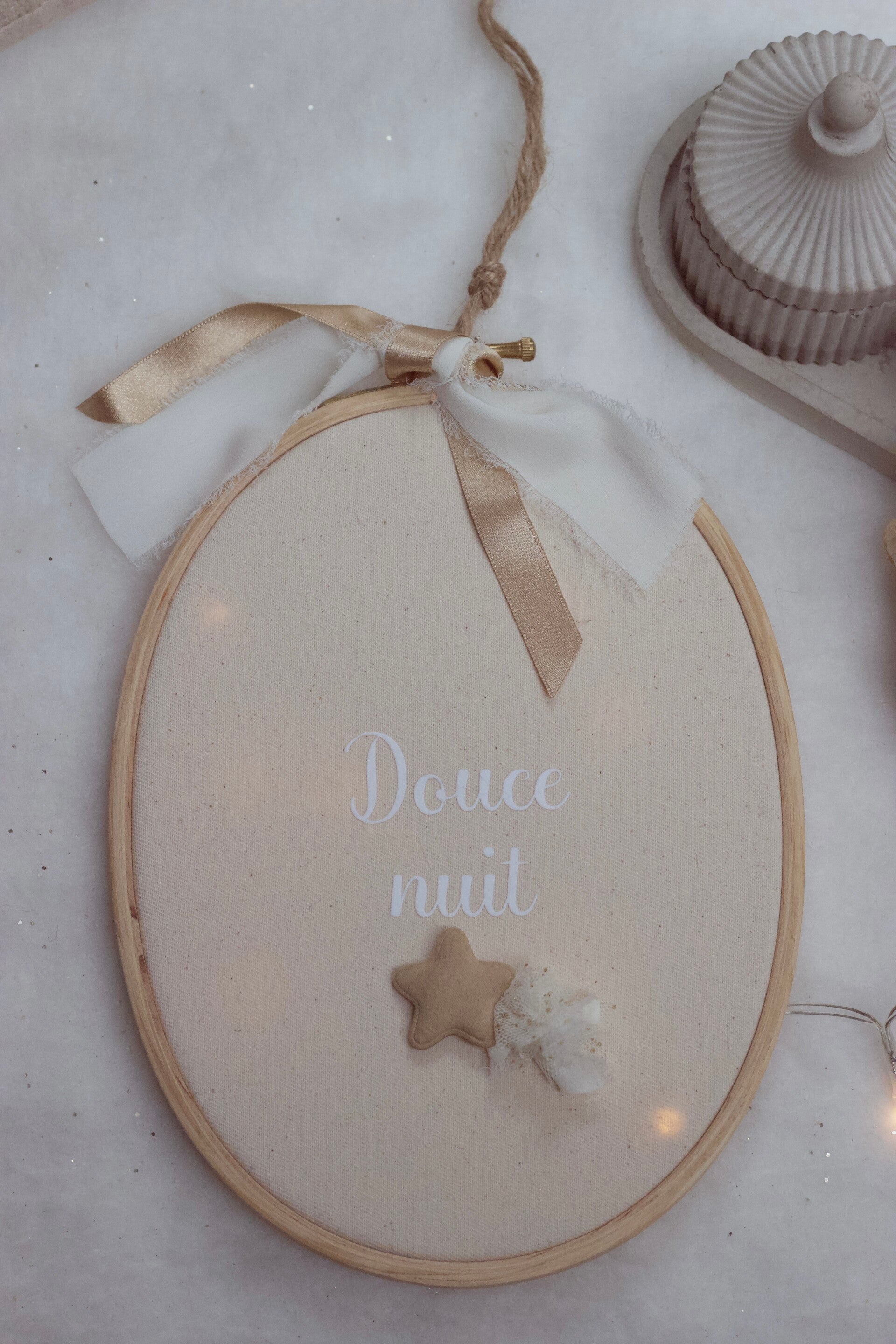L’inscription "Douce Nuit", en flocage velours blanc, ajoute une touche d’élégance à cette décoration murale à la fois douce et polyvalente.