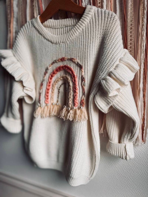 Découvrez notre pull brodé à la main, un hommage au style bohème avec ses couleurs vives rappelant un arc-en-ciel. Personnalisez-le en ajoutant un prénom ( sous l'arc en ciel )pour une touche unique. Un vêtement authentique qui célèbre l’artisanat et l’individualité.