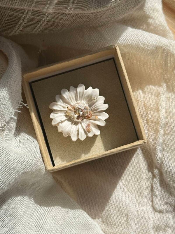 Découvrez cette bague unique, entièrement façonnée à la main pour un rendu authentique et raffiné. Réalisée en jesmonite, un matériau innovant et résistant, elle est ornée d’éclats de coquillage délicatement brisés à la main, offrant ainsi un design naturel et élégant.