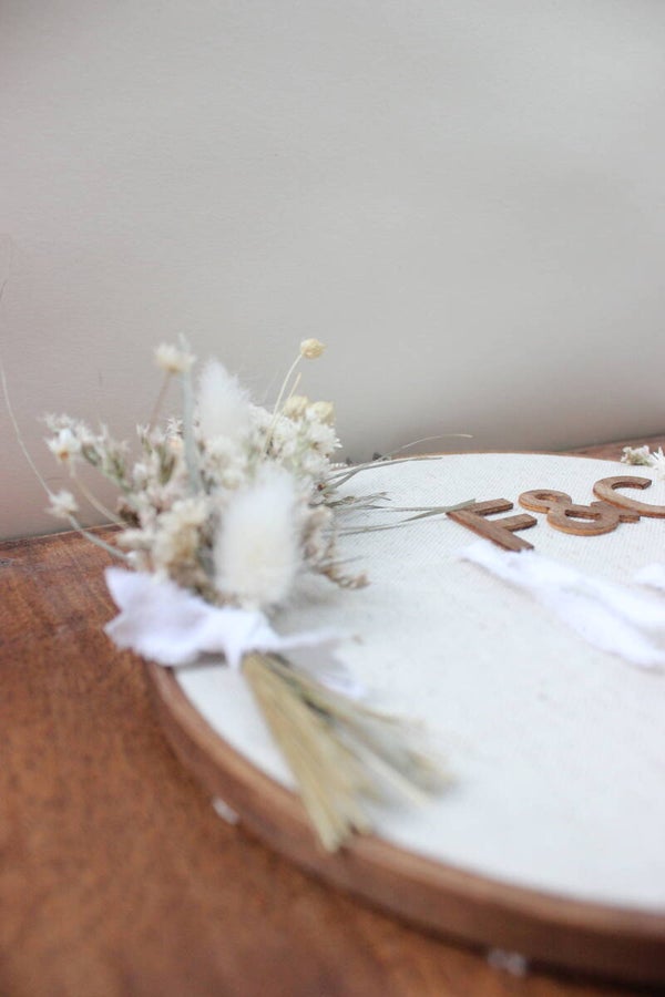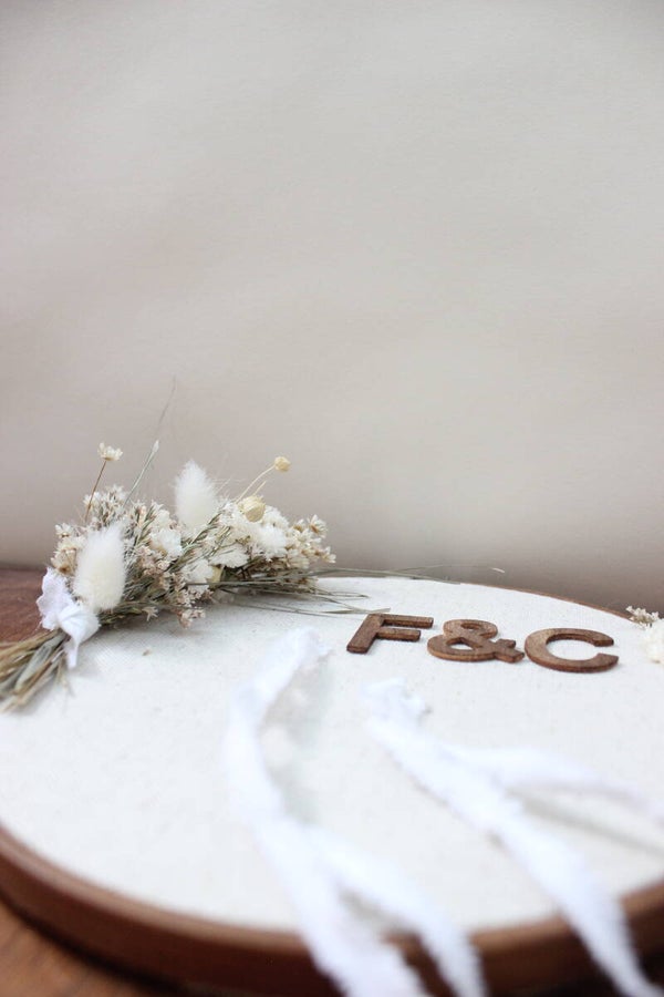 Personnalisation en accord avec le thème de votre mariage, lettre en bois pour vos initials, fleurs séchées.