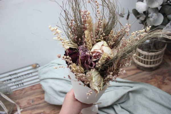 Joli bouquet naturel, durable, composé de fleurs séchées et fait à la main.