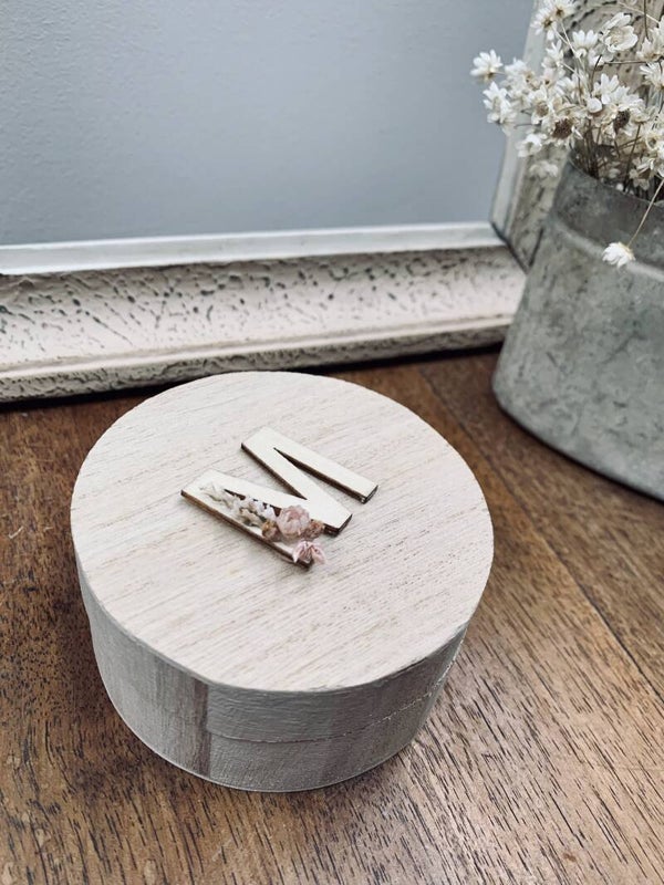 Boite en bois ronde, décorée de fleurs séchées et de la lettre M pour « Maman » sur le couvercle.