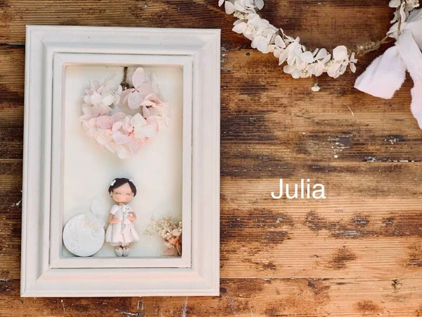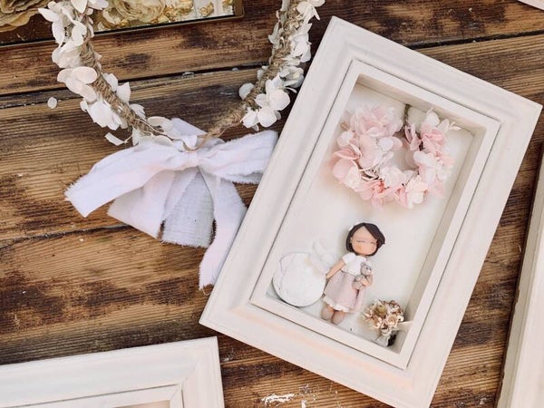 Je vous propose grâce à cette collaboration un tableau fabriqué avec du pin français et peint dans mon atelier, décoré d’une mini figurine, une mini-couronne en hortensias préservées et d’un mini-bouquet qui fera un tableau unique.