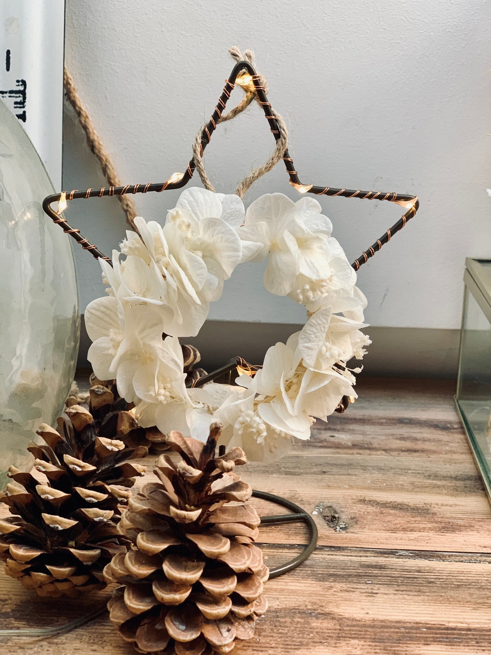 Entièrement faite d'hortensia préservé blanc et broom bloom.