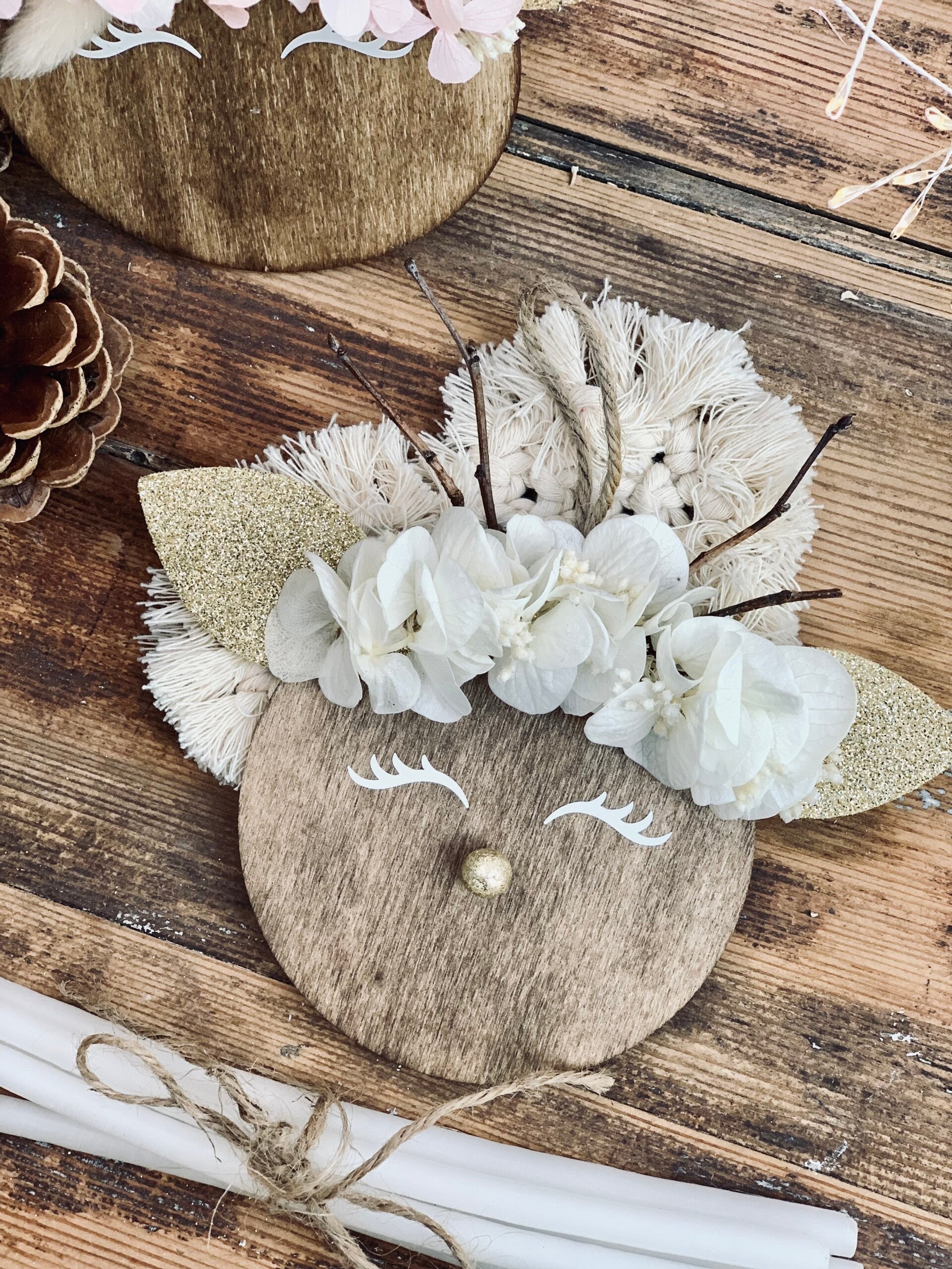 Suspension sapin " Petit Rennes et sa couronne de fleurs séchées" fait entièrement à la main.