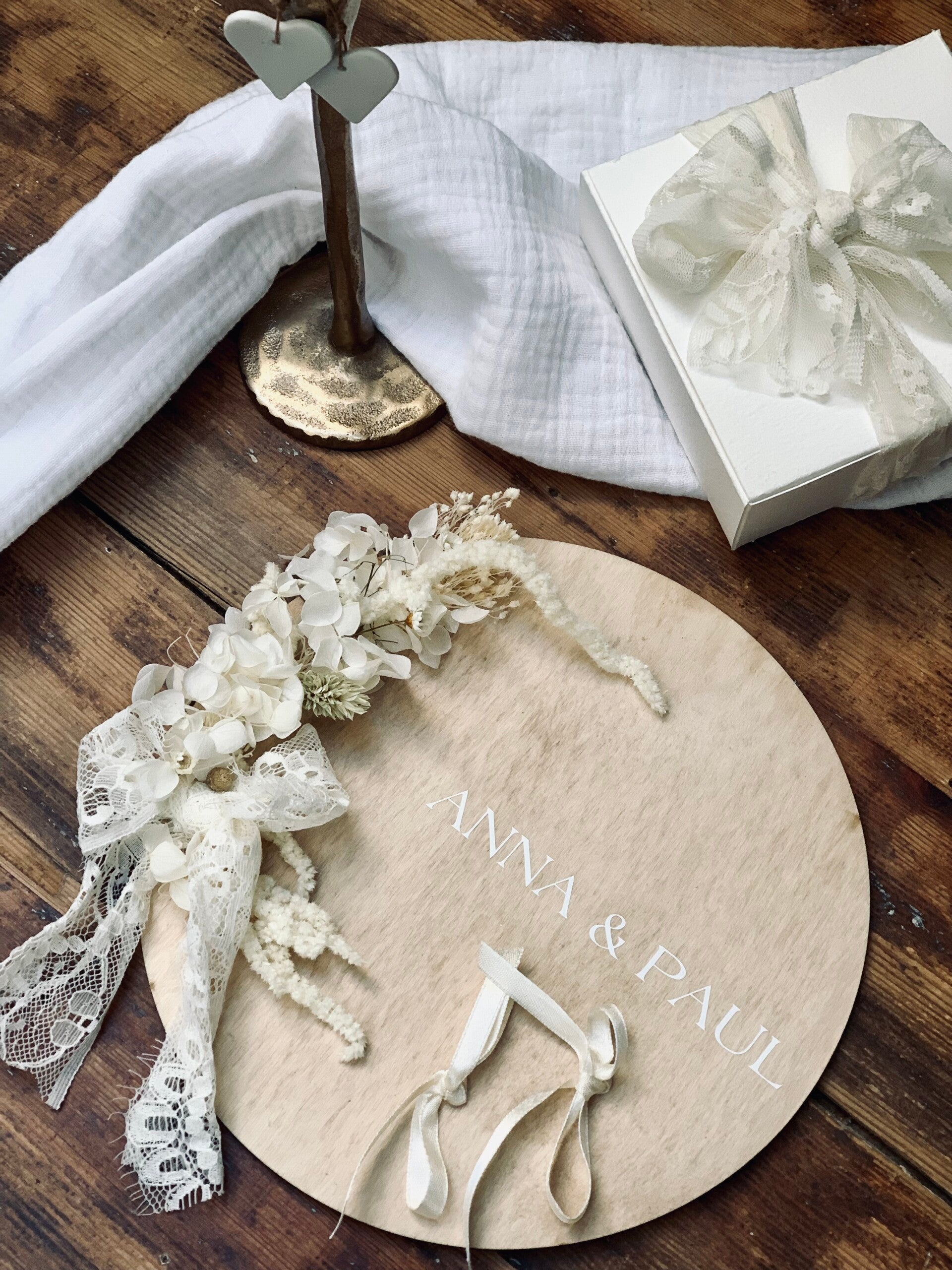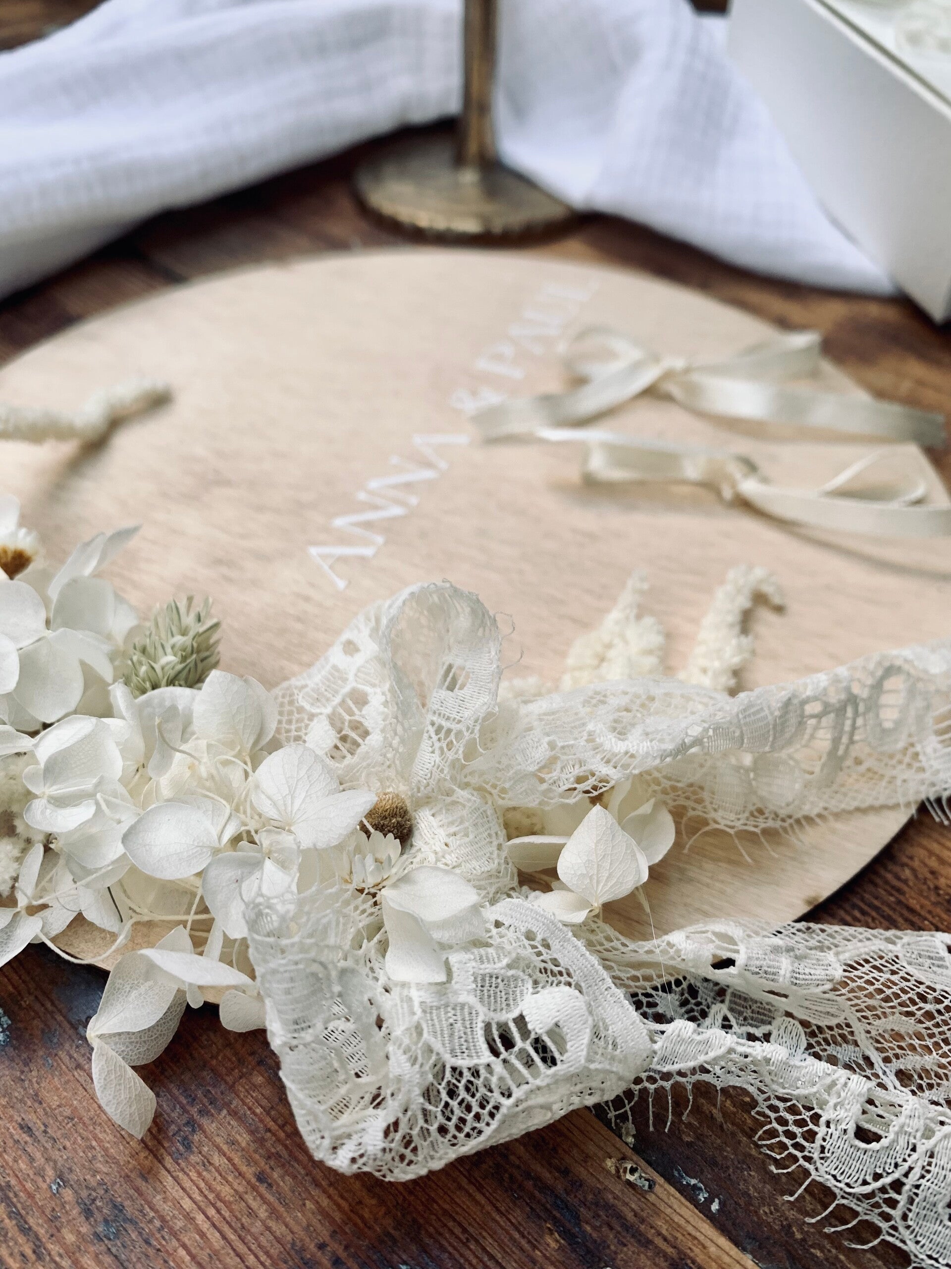 Je vous propose un porte alliances fait entièrement à la main pour sublimer les anneaux qui uniront vos vies. Sur un cercle en bois (20 cm) quelques fleurs séchées que j'adapte à vos couleurs, vos prénoms avec possibilité d'y ajouter une date.Nous échangerons sur vos envies, définirons ensemble ces petits détails qui sont si importants. Après votre grand jour, vous pourrez vous en servir de porte bagues sur une commode.