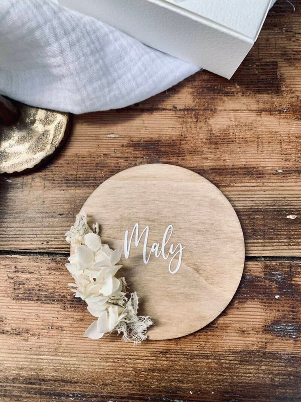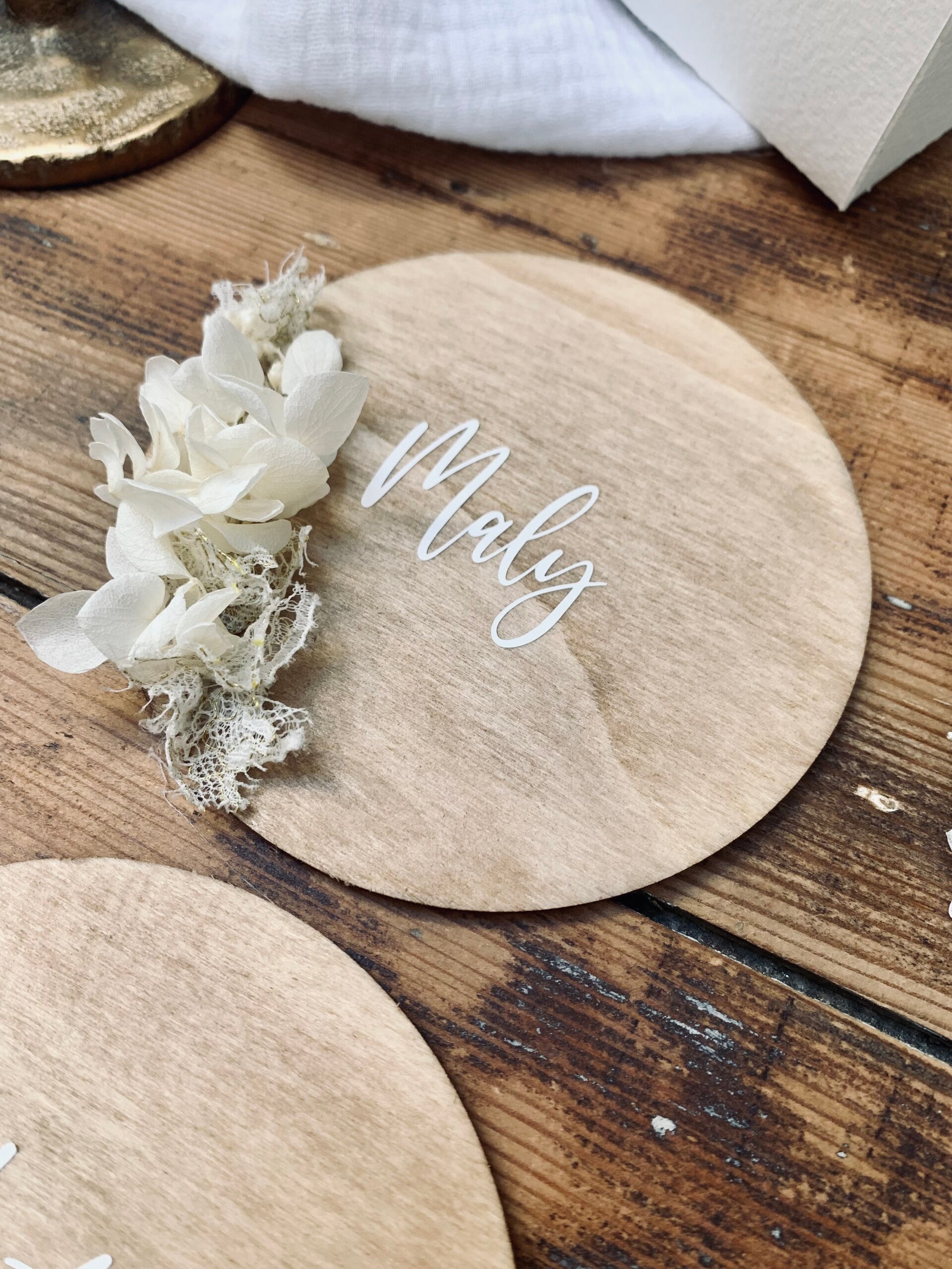 Mes marque-places fleuri en bois rond ou coeur (10 cm) personnalisable sont la touche finale parfaite pour votre événement.