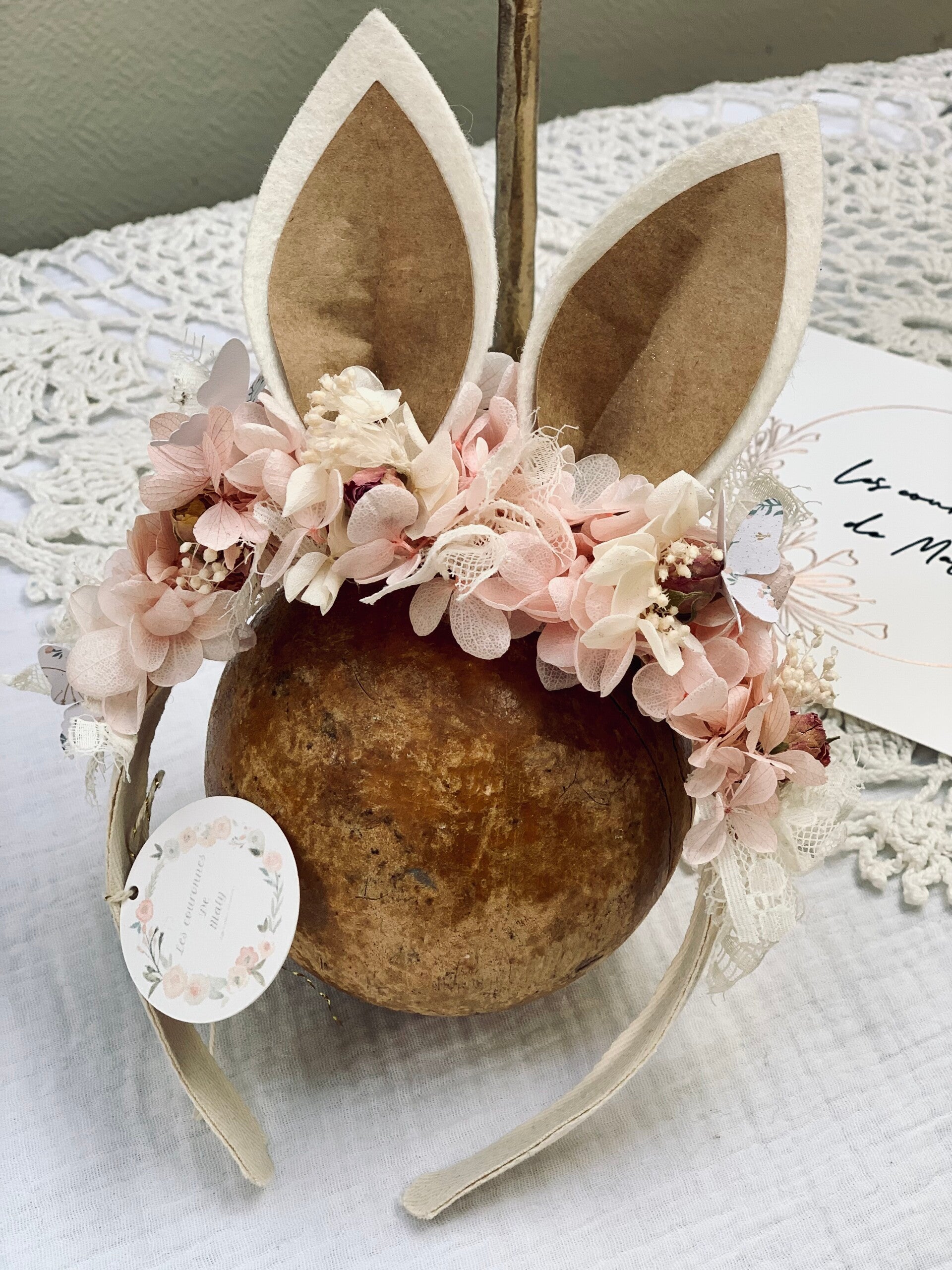 Lapin orné de fleurs séchées ( beau volume) et de dentelles .